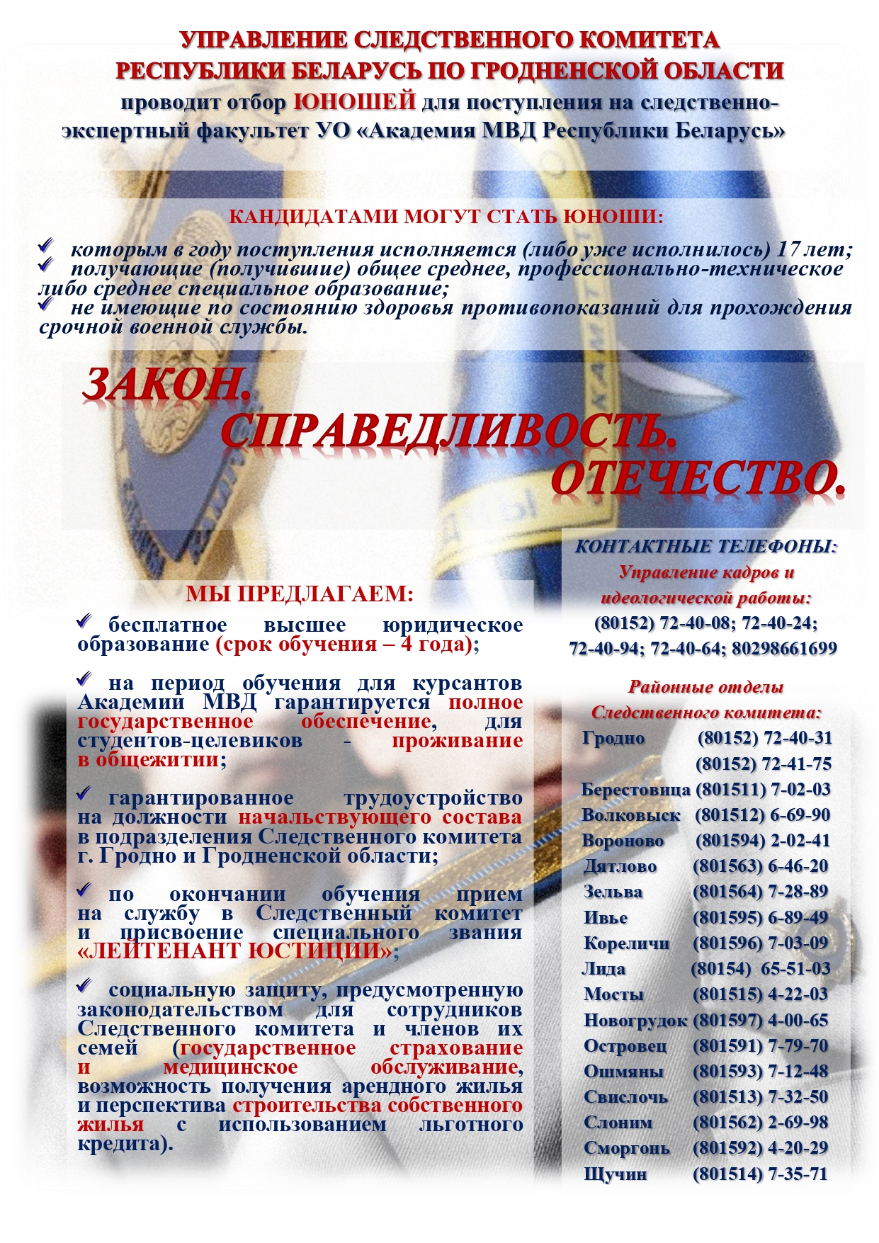 Управлением Следственного комитета по Гродненской области на постоянной основе проводится целенаправленная профориентационная работа. На базе ведомства регулярно проходят «Дни открытых дверей». Также сотрудники УСК посещают подобные мероприятия, организовываемые на базе высших учебных заведений г. Гродно, школ и гимназий области.